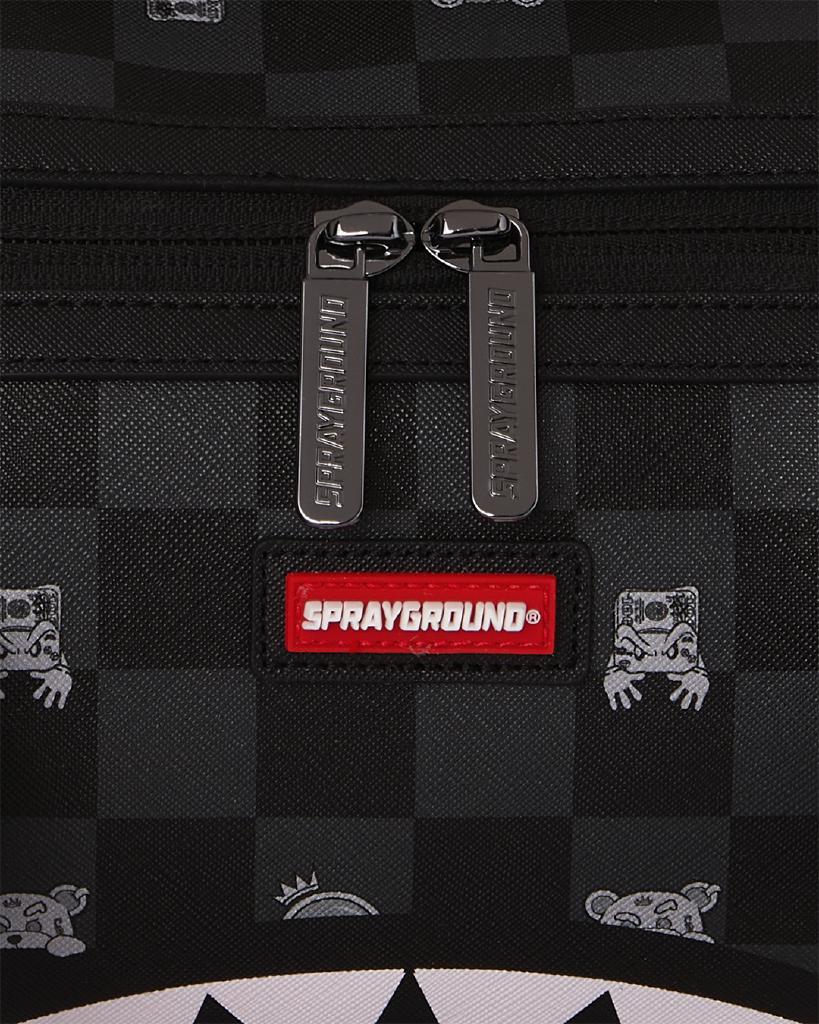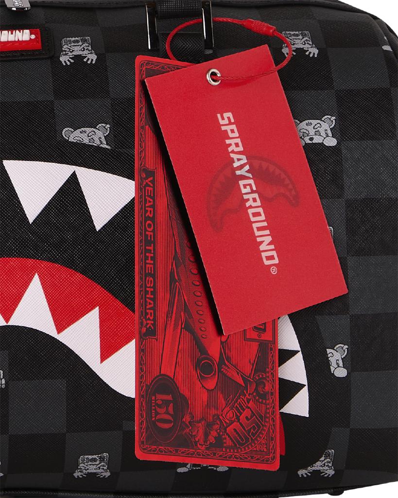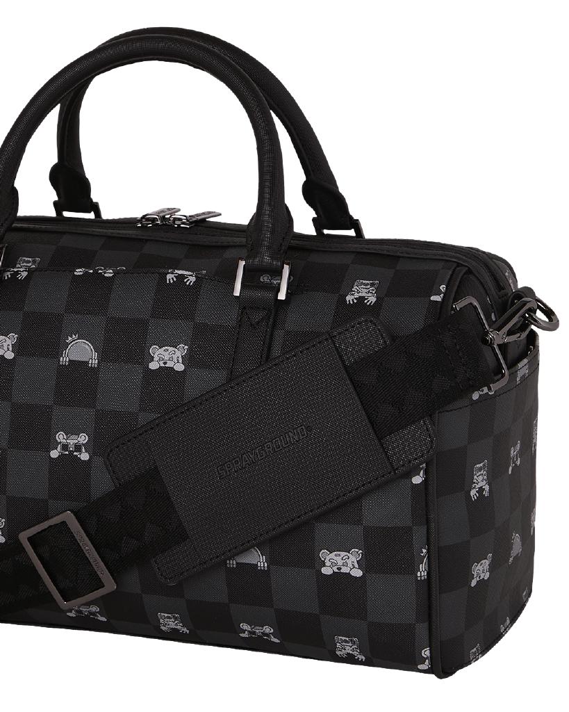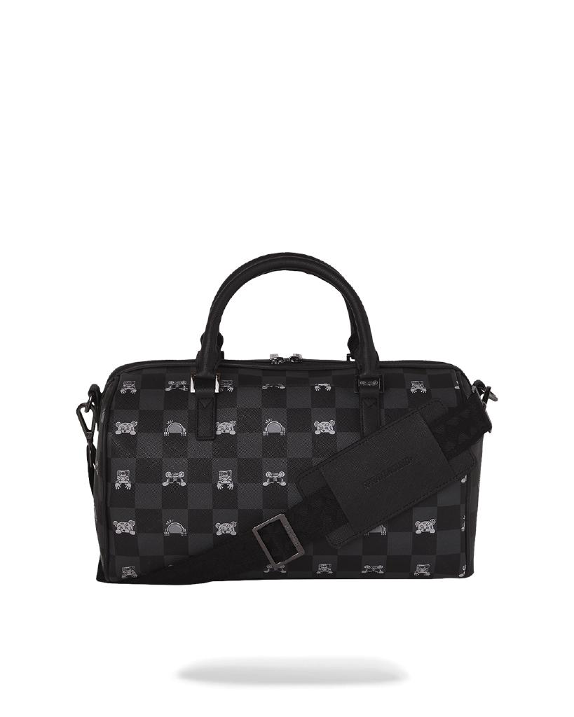 Borsa Sprayground nero, rappresenta la grafica "GRAY PEEKING CHARACTER CHECK MINI DUFFLE" . Realizzato in eco-pelle
