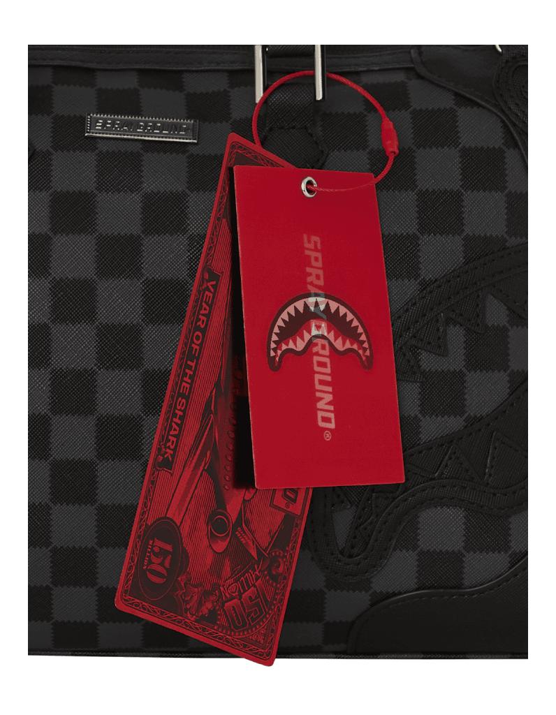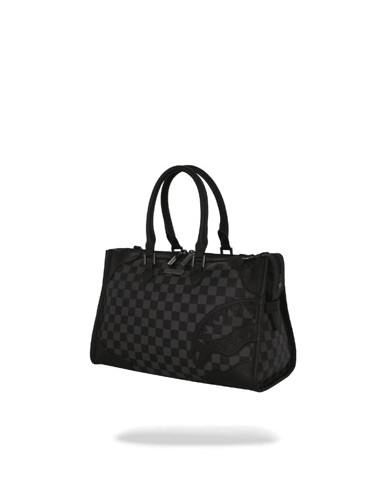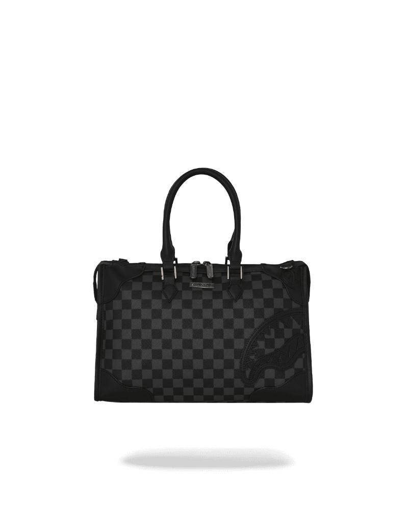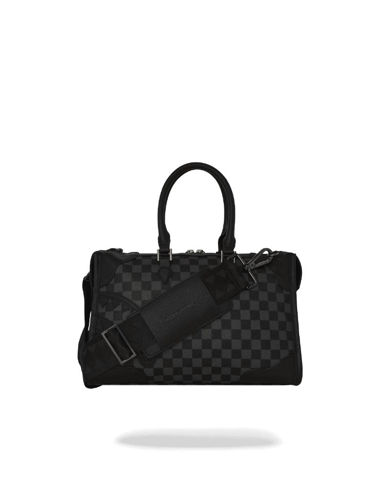 Borsa Sprayground nero, rappresenta la grafica "midnight chateau pyramid mini duffle" prima uscita del nuovissimo modello.