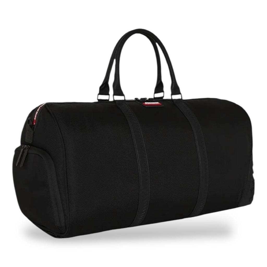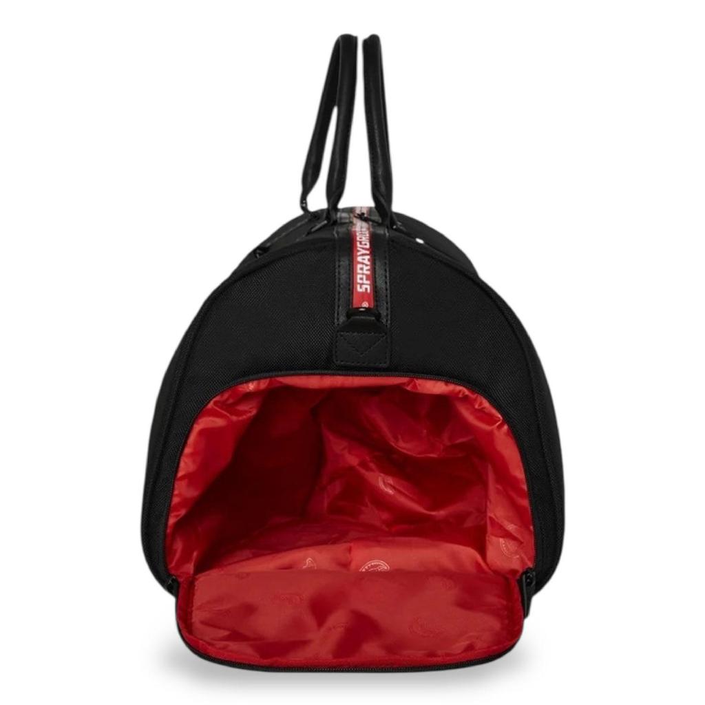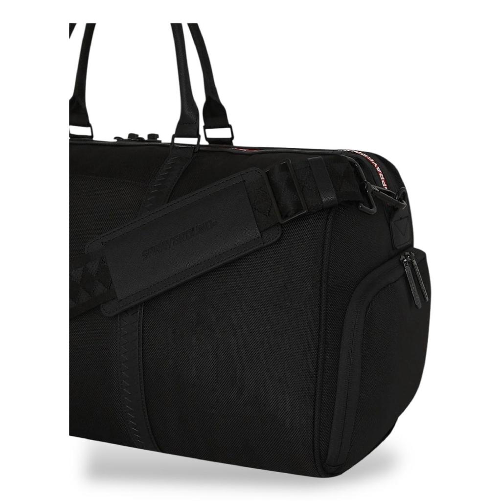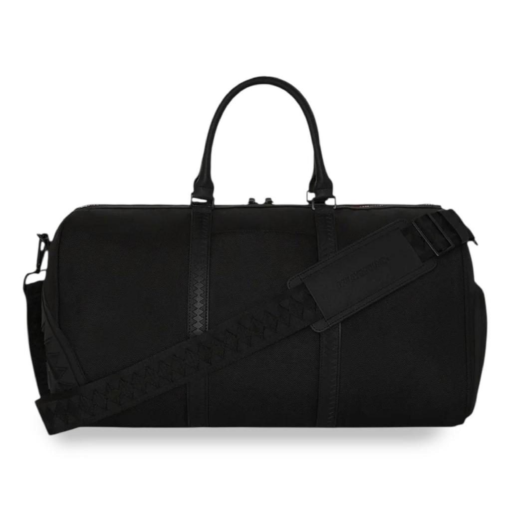 Borsone Sprayground nero, rappresenta la grafica "Printed zipper shark duffle large duffle". Realizzato in tessuto resistente e