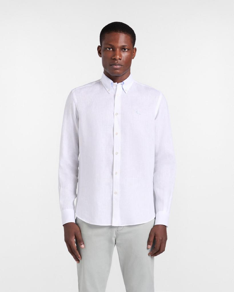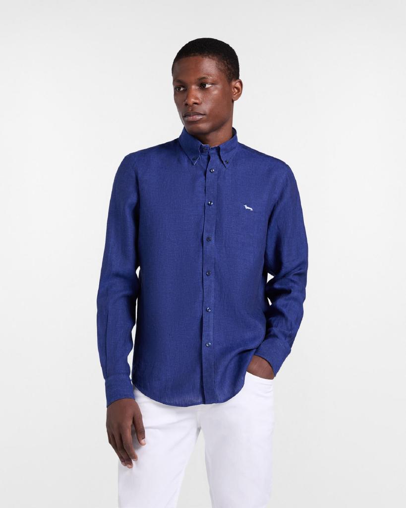 bottoncini, interno polsini a contrasto e bassotto ricamato lato cuore. Ideale per ogni occasione, questa camicia in lino offre una