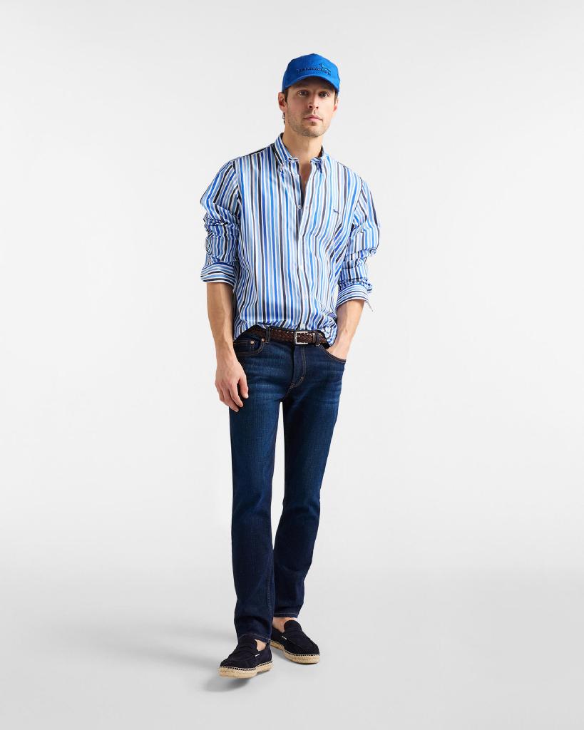 Scopri questa camicia uomo in fresco popeline di cotone con stampa a righe effetto acquerello. Collo con bottoncini, intorno polsi a