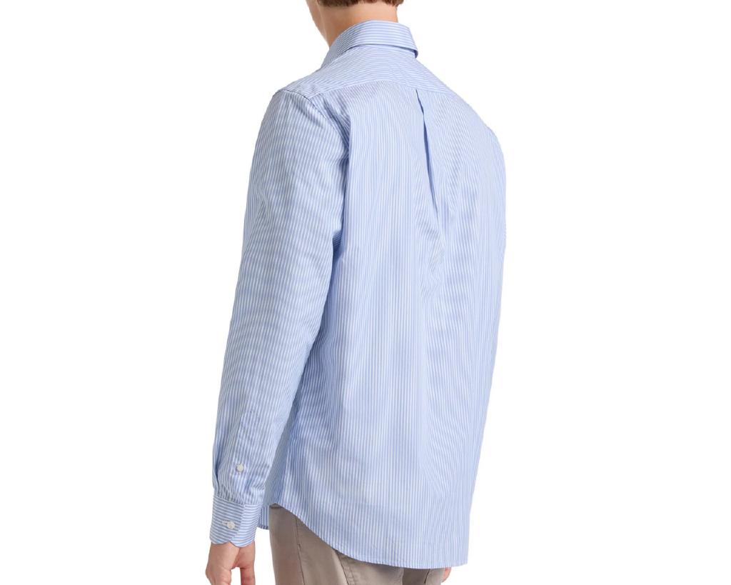 regular, è rifinito dal pratico collo con bottoncini e dal raffinato carré con sfondo piega sul retro, mentre il tessuto a contrasto nel