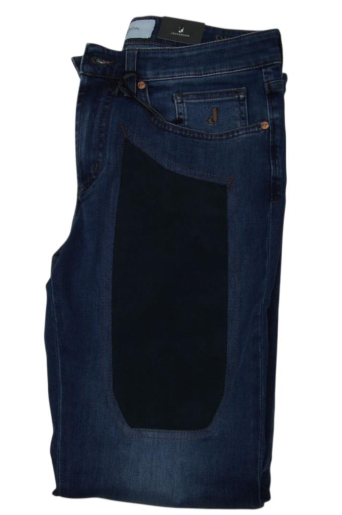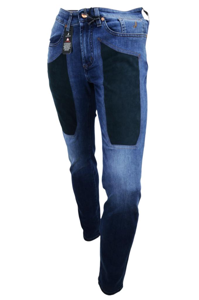 Splendido jeans firmato Jeckerson in lavaggio medio slim fit con toppe in alcantara in colore blu